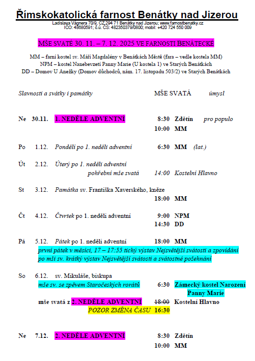 POZOR: v sobotu 6.12. mimořádně mše sv. v Kostelním Hlavně od 16:30 hod.!
