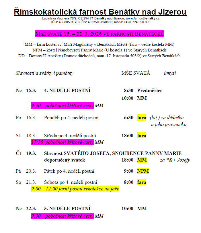ve čtvrtek 19.3. o Slavnosti sv. Josefa bude mše svatá v 18 hod. ve farním kostele sv. Máří Magdalény