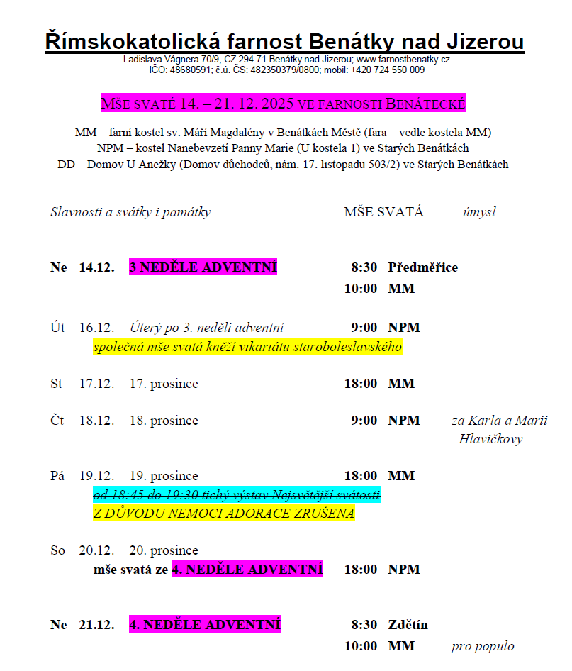 Bohoslužby 14. - 21.12.2025